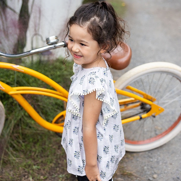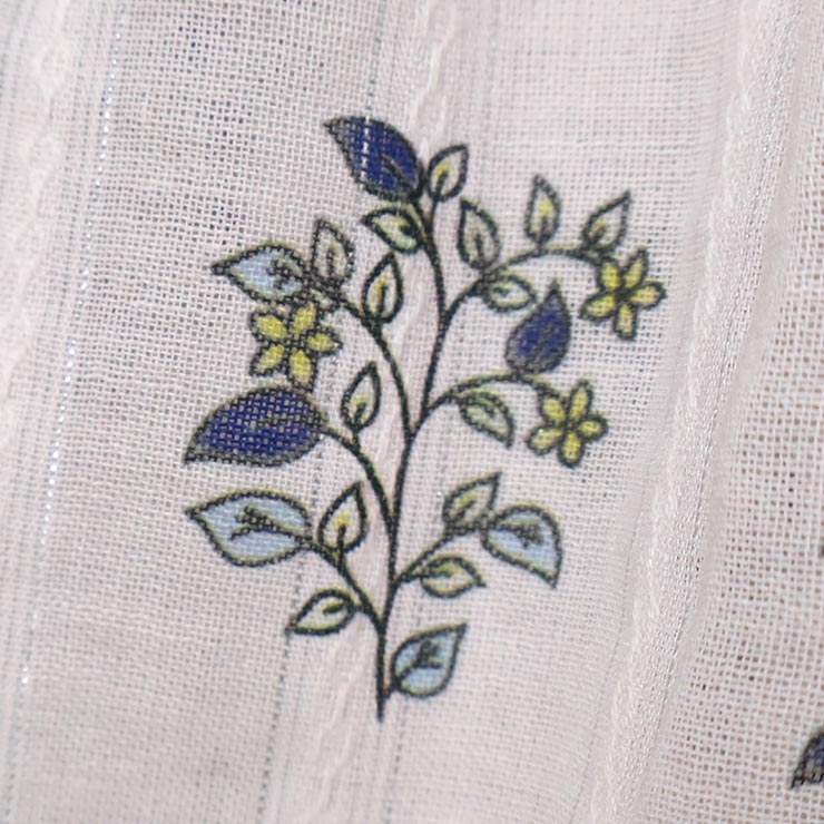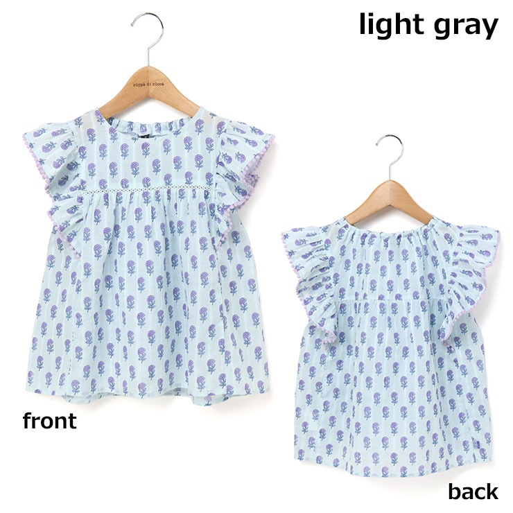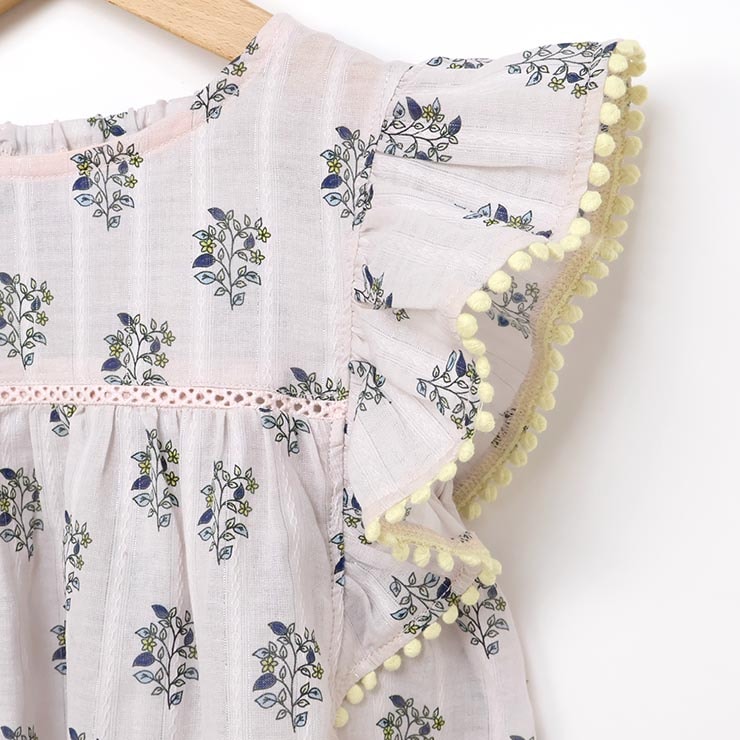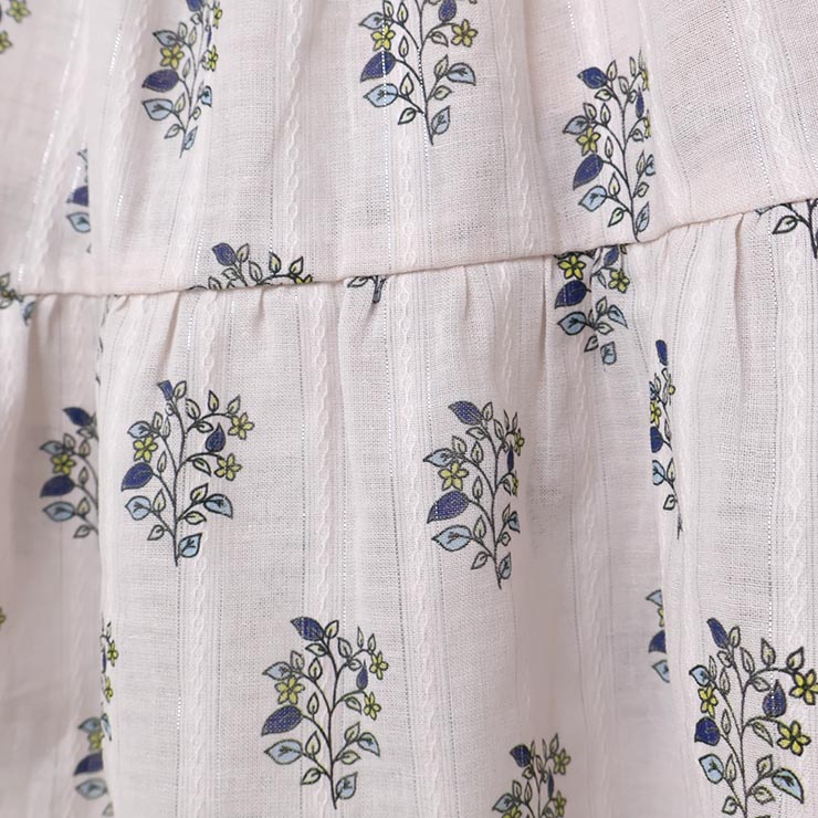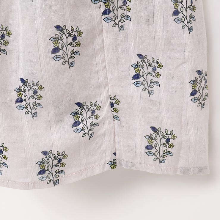 | ベースはラメ糸入りのローンジャガード素材。オリジナルプリントのエスニック感漂うフラワーモチーフ柄でリゾートっぽく夏らしい雰囲気に。大振りの袖フリルと水玉レースがかわいい♪ |