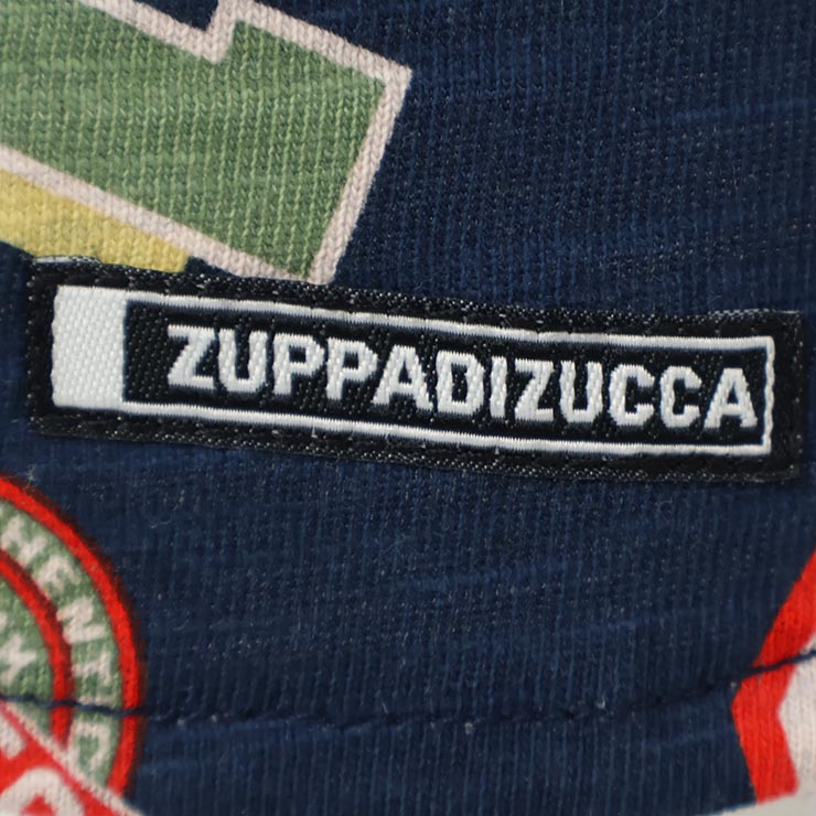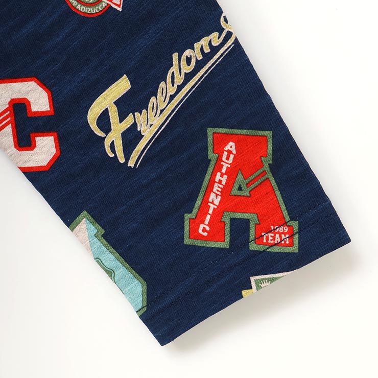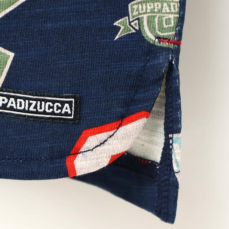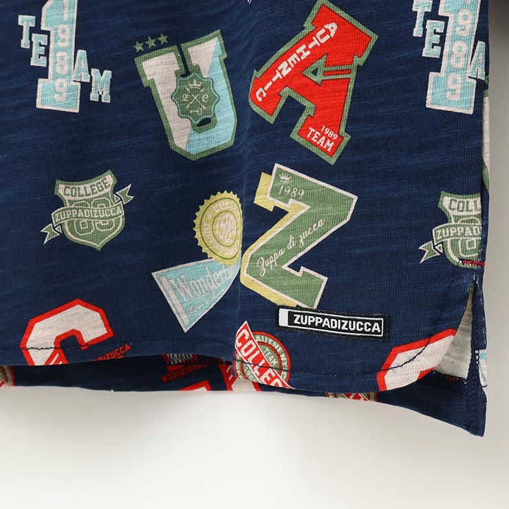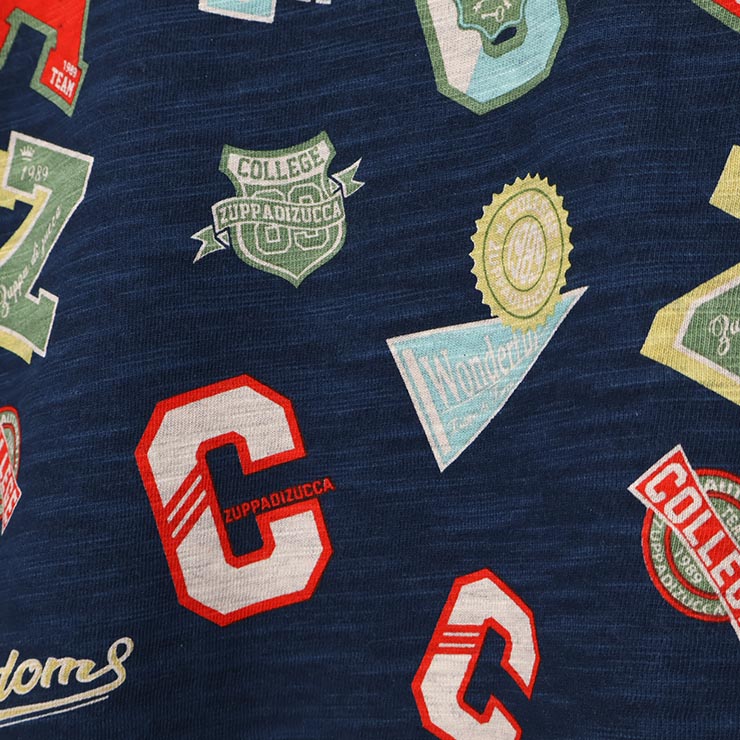 | カレッジモチーフを散りばめた総柄プリント。一つ一つがズッカオリジナルのエンブレムモチーフになっています。土台の生地は表面変化のあるスラブ天竺。その影響で出るプリントのかすれ感がカジュアルでカッコいい☆☆ |