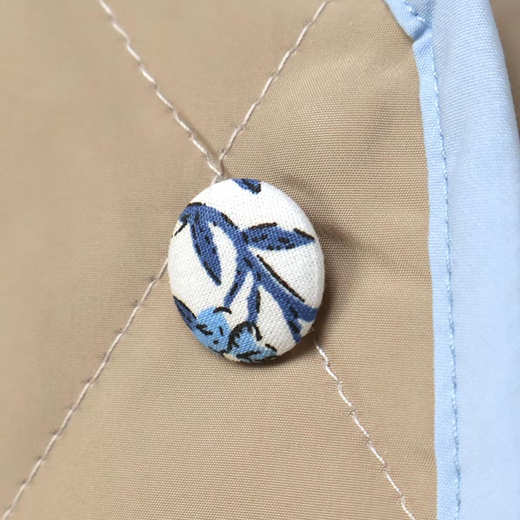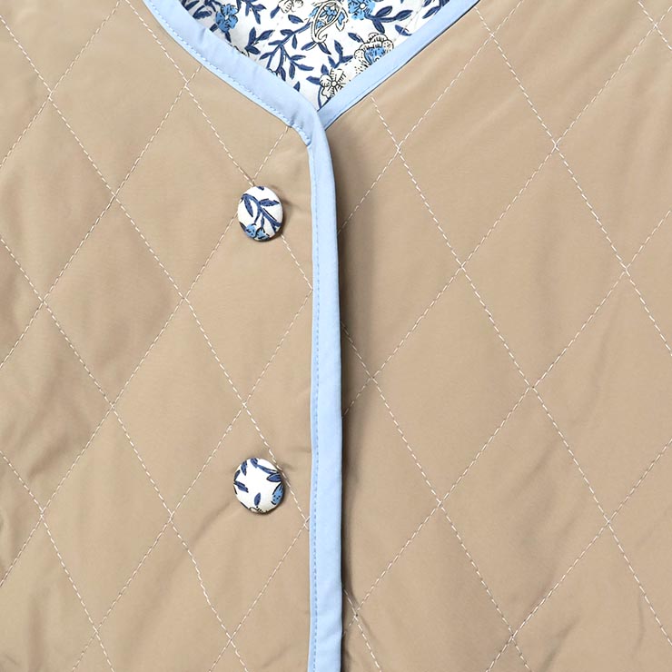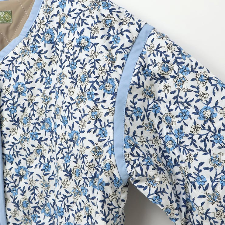 | 表側は花柄プリント、裏側は無地で表裏で印象が異なるリバーシブル仕様。ノーカラーでV型のネックのラインがおしゃれ度をアップさせています。シーンに合わせてコーディネートが楽しめます! |