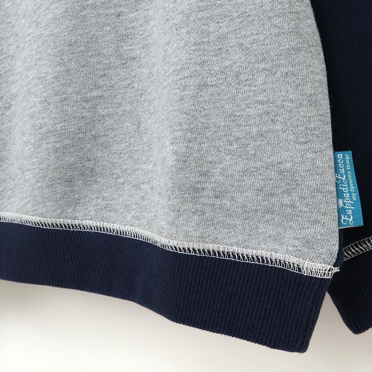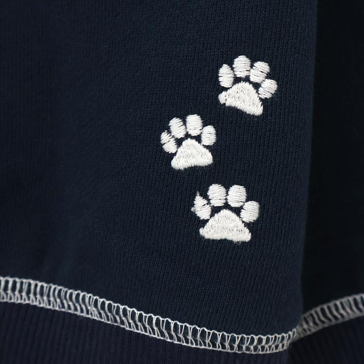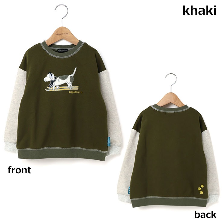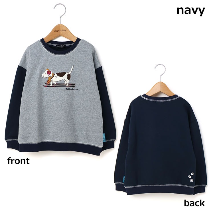| 普段使い出来る秋冬定番のやや厚な裏毛トレーナー。柔らかい裏毛で着心地が良いアイテムです。胸には犬のサガラ刺繍。後右下には足跡刺繍が、、、ワンちゃん大好きな親子でお揃いコーデもオススメです。 |