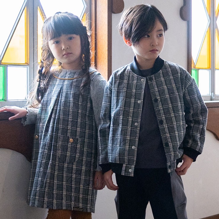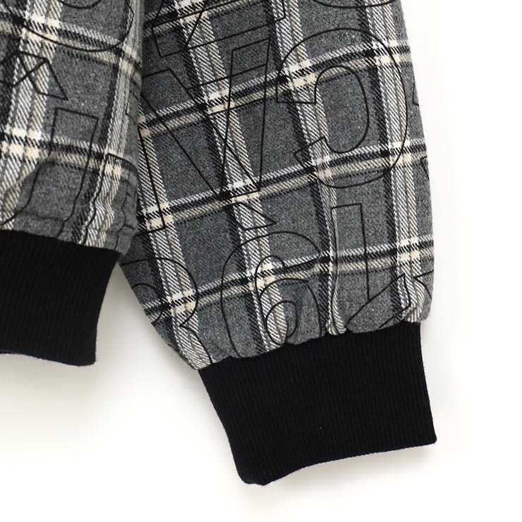 | 今季お薦めのオリジナル柄を施したチェック柄ブルゾン。クラシカルなチェック柄にアルファベットをMIXしたオリジナル柄が特徴的です。女児用にジャンパースカートも展開しているので兄妹ペアにもできるお薦めの1枚です |
