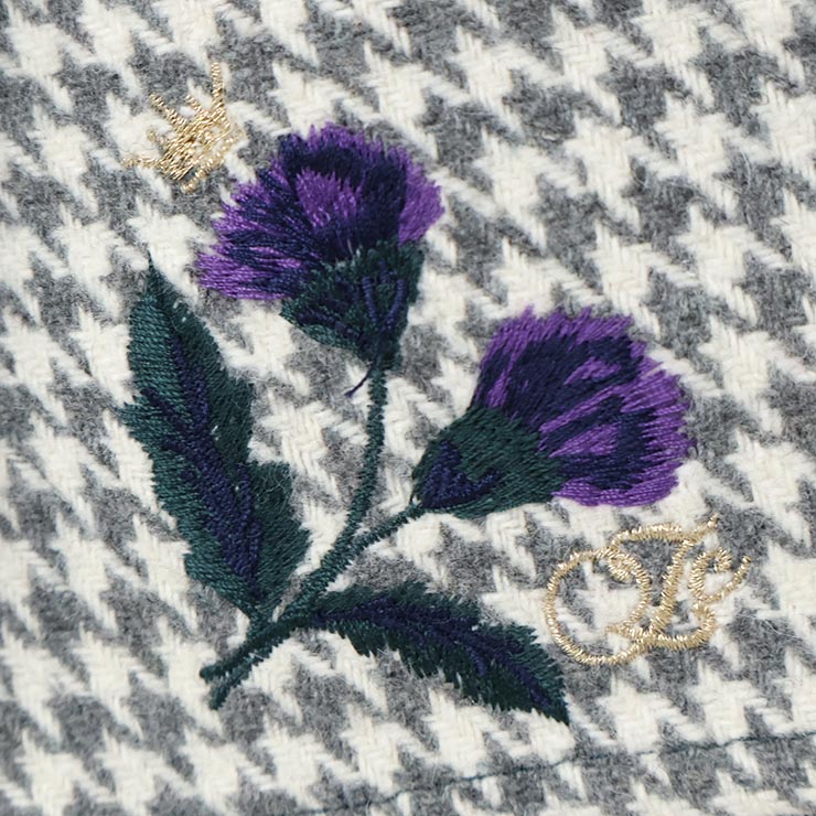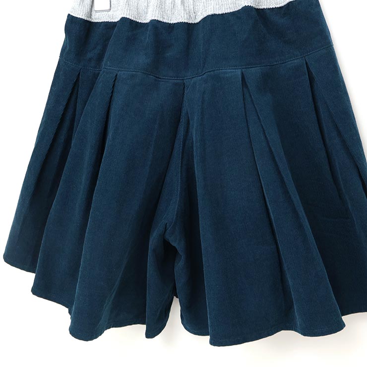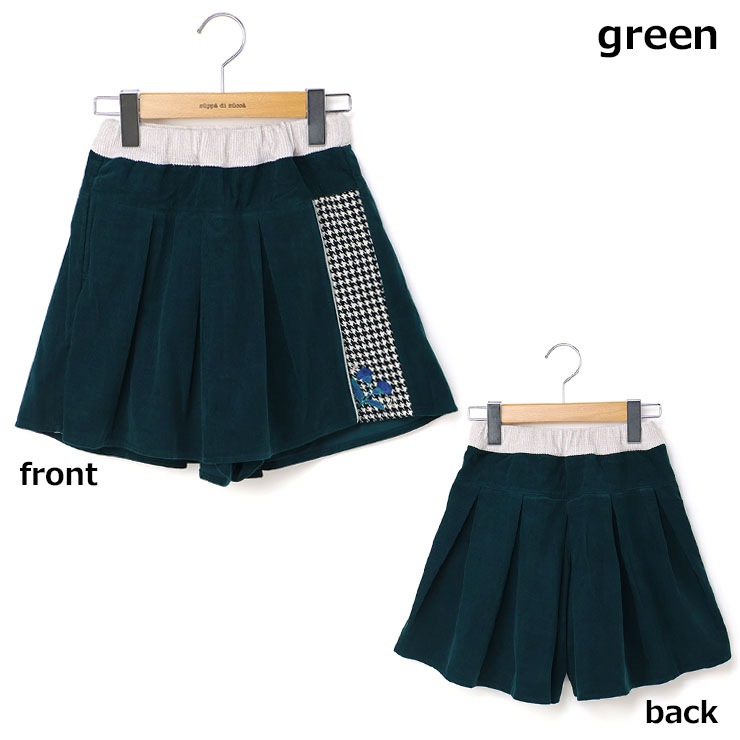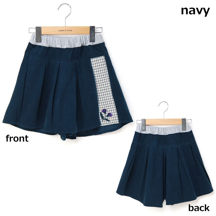 | パっと見スカートに見えるキュロット。前身の覆い布をめくるとカワイイ千鳥柄なパンツが登場します。千鳥部分はウールが一切はいっておらず肌ざわりも良い素材です。覆い布端やウエストのラメ、左裾の刺繍がおしゃれ感を引き出しています。 |