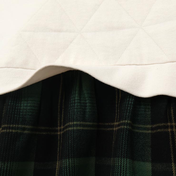 | 肌ざわりが良いニットキルトとチェックがドッキングされたワンピース。1枚でカジュアルに着こなせるアイテムです。温かみのあるトラッドなチェックと左胸のチャームがデザインポイント♪ |