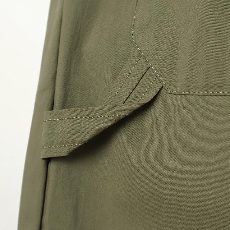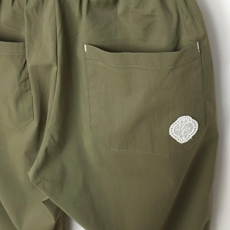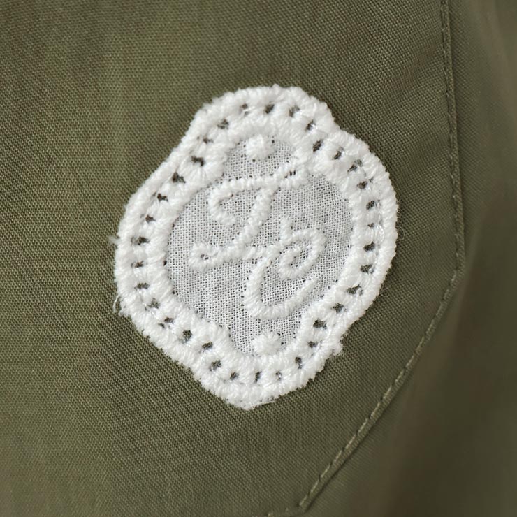 | 薄手の張り感が心地良く春から夏にかけて大活躍のパンツ。ストレッチもしっかり入っているので履き心地も抜群です。やや丸みのあるシルエットが今どきで裾見返しのレースもオシャレ。裾レースを使用したポケット口のクルミ釦もデザインポイントの一つです。 |
